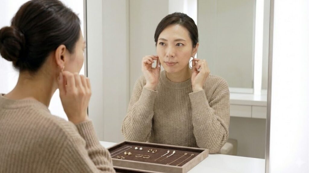 - 面長さん:縦の長さを強調しないよう、横にボリュームが出る「フープピアス」や、耳たぶに収まる丸みのあるデザインでバランスを取ります。