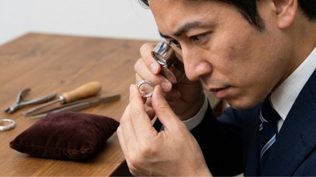 まず、確認すべきなのは刻印の精度です。正規品には「TIFFANY & CO.」などのブランドロゴが細部まで綺麗に刻まれていますが、偽物の場合はフォントが粗かったり、文字の間隔が不自然だったりすることがあります。肉眼での確認が難しい場合は、ルーペなどを使うと違いがはっきりわかります。
